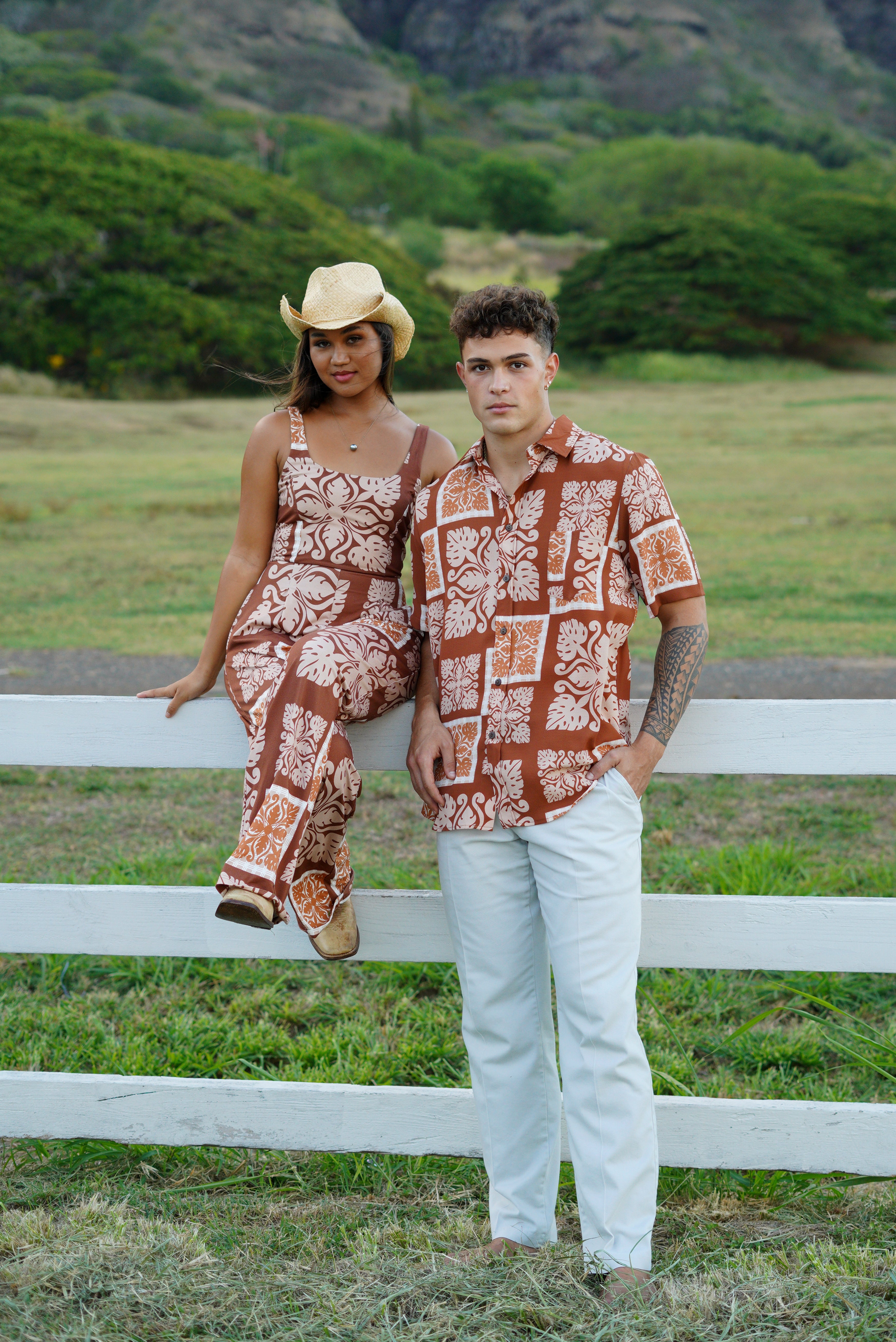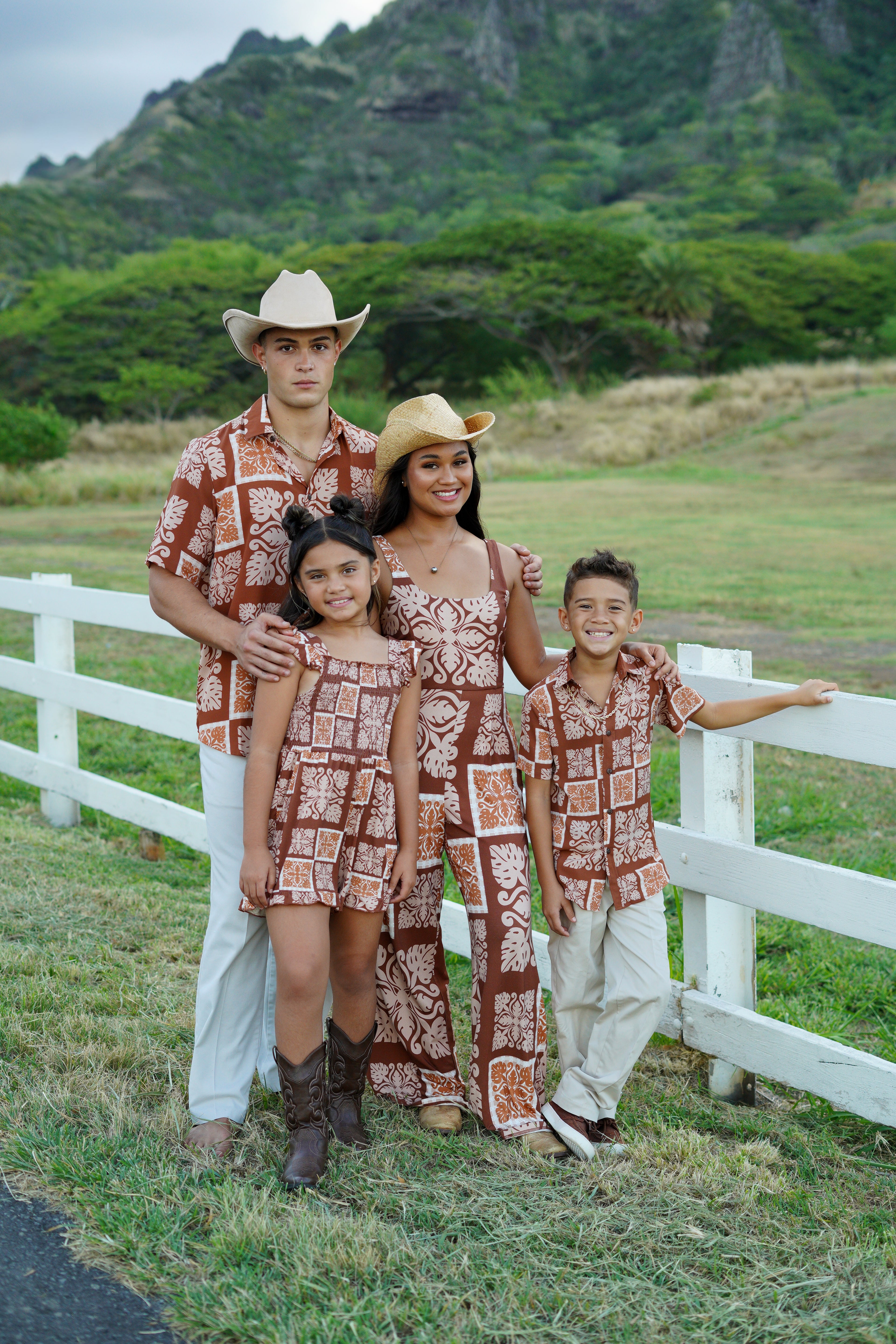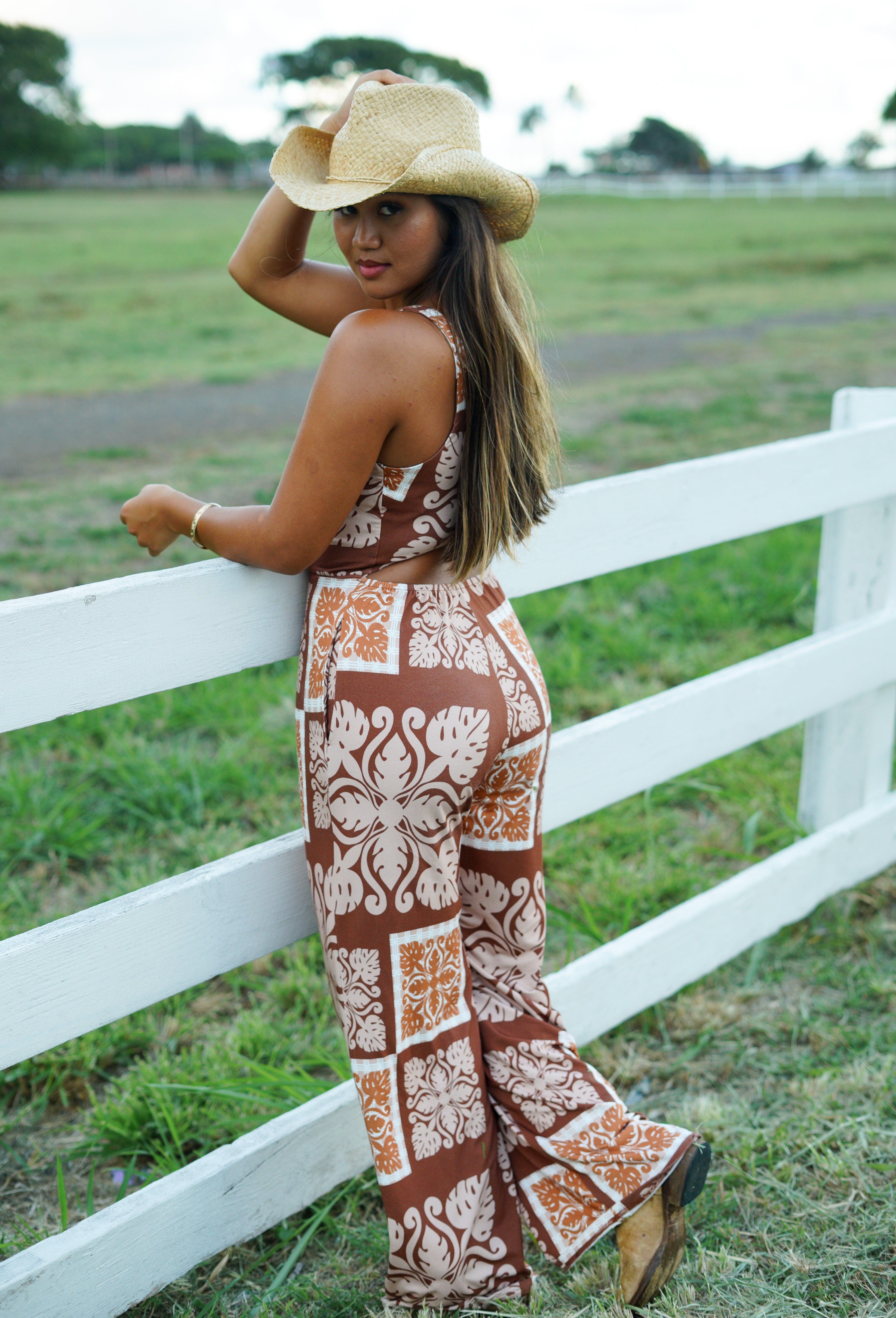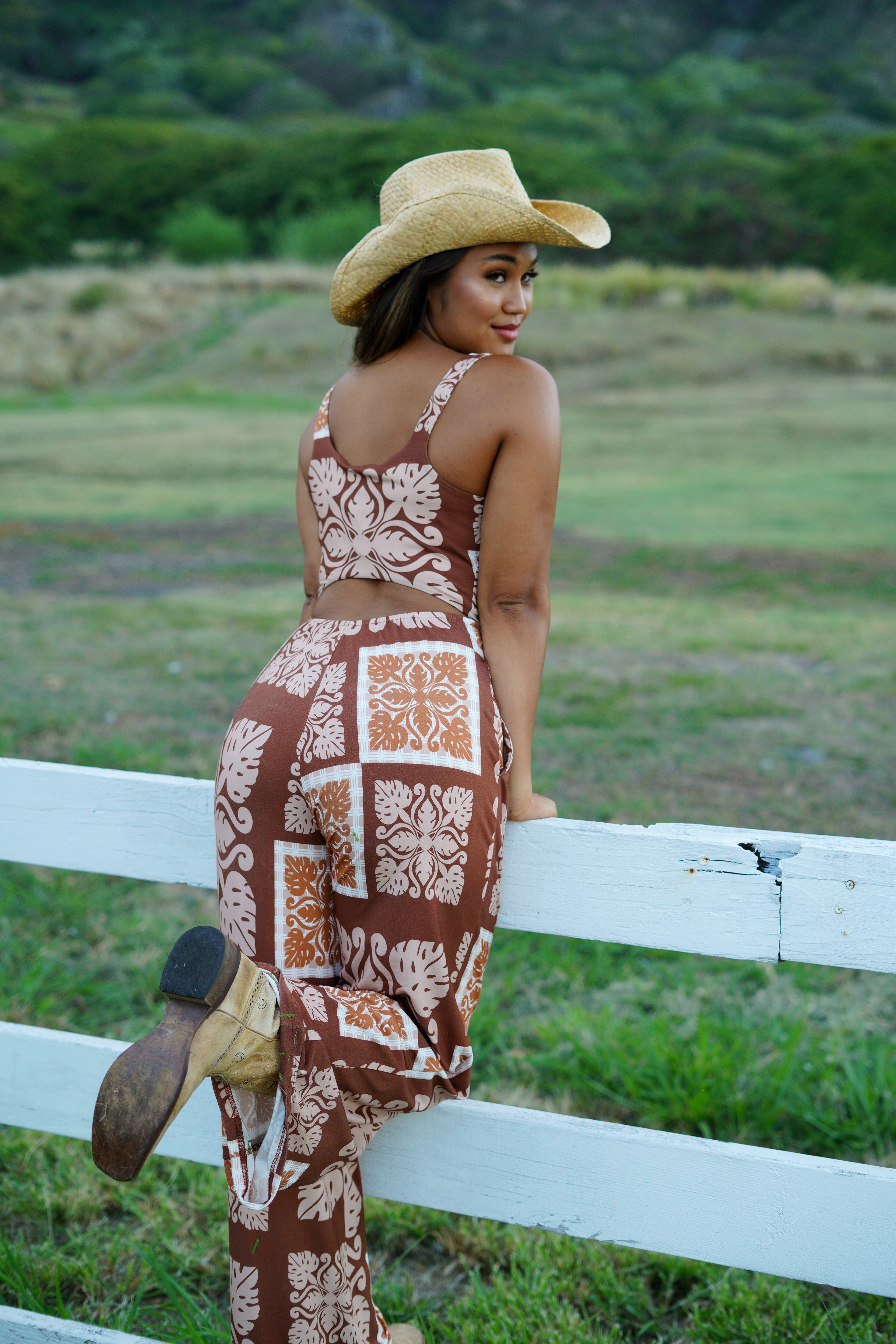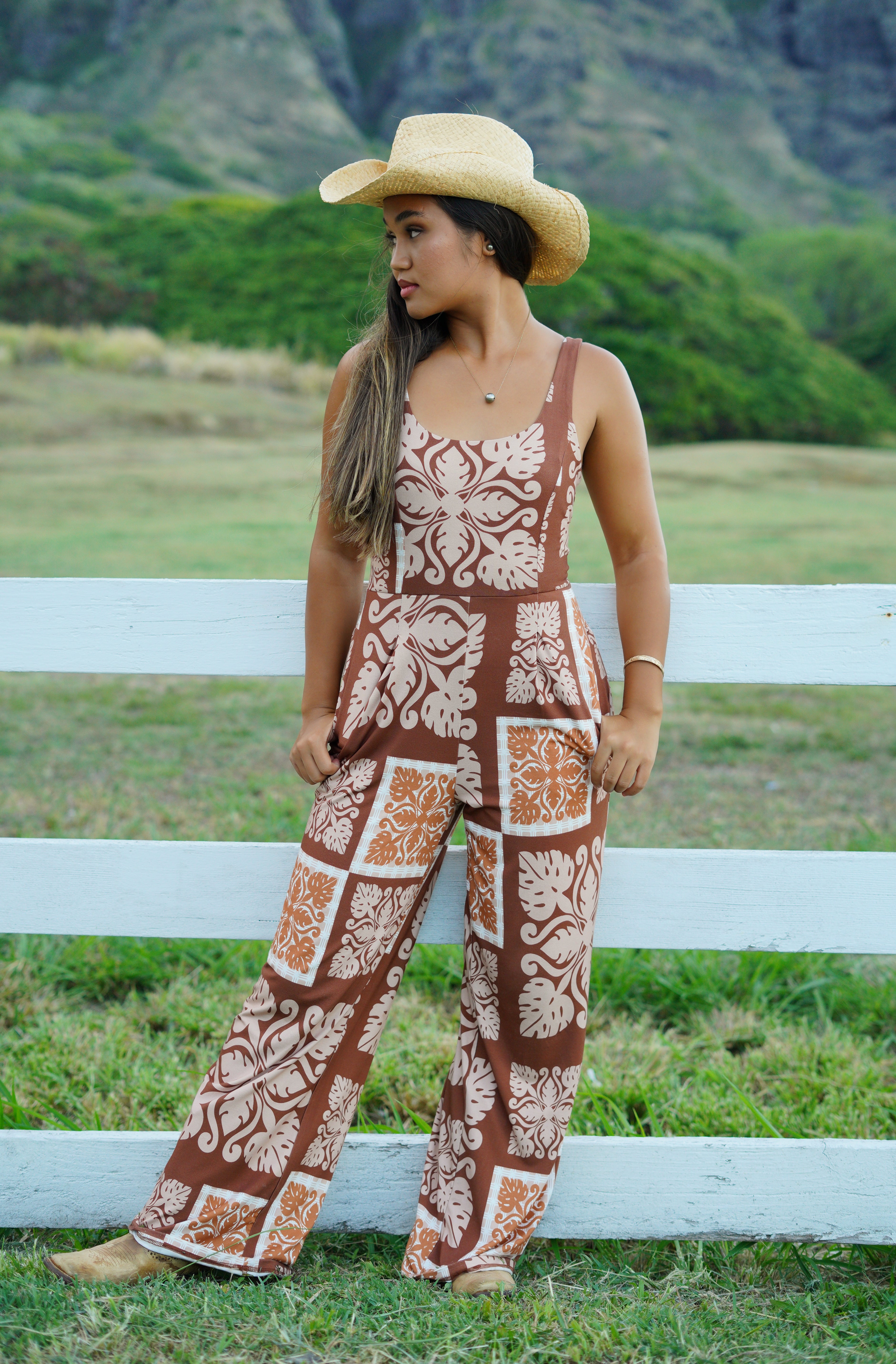 The Kyla Jumpsuit is stretchy and comfortable! Available in Country Quilt Rust.