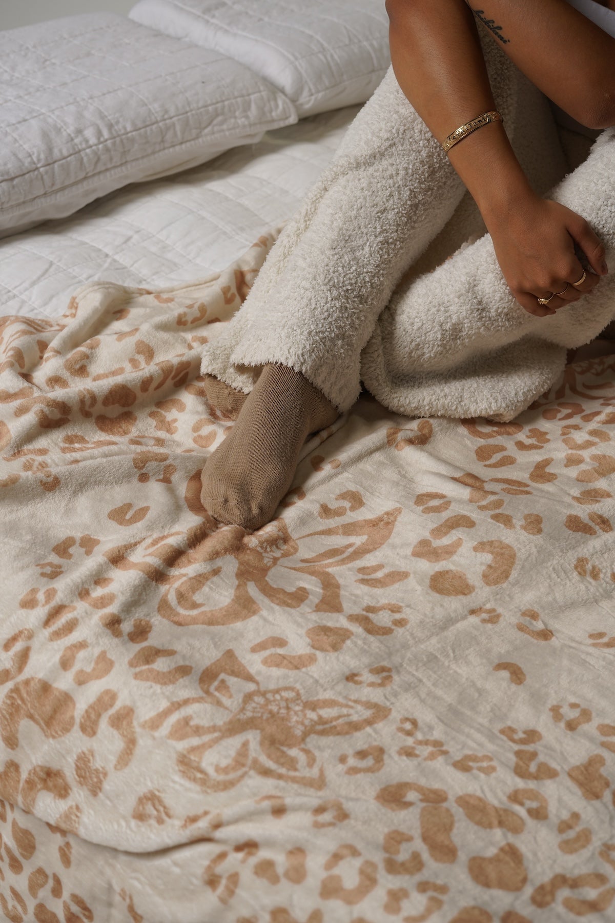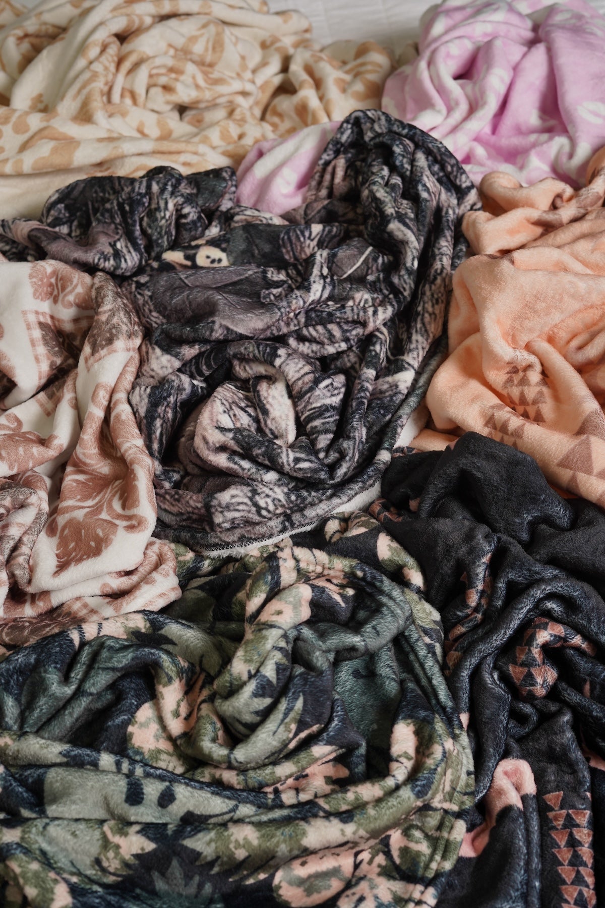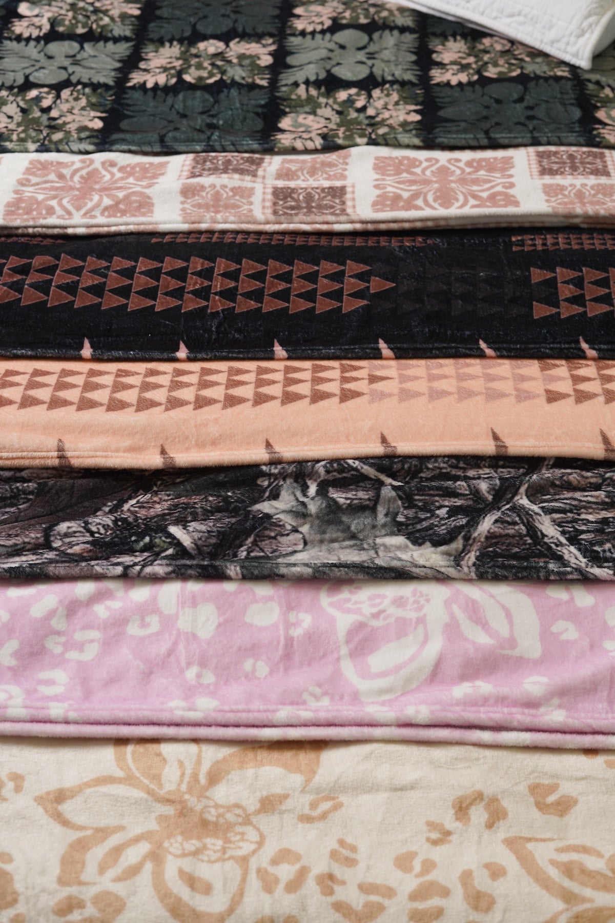 The Pumehana Blanket is extra large and cozy! Available in 7 prints: Mauka, Lōkahi Black, Lōkahi Nude, Country Quilt, Orchid Cheetah Nude, Orchid Cheetah Lilac, and Ulu Army.