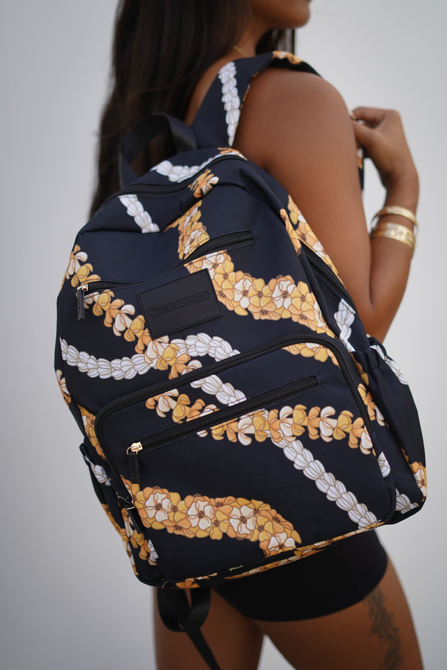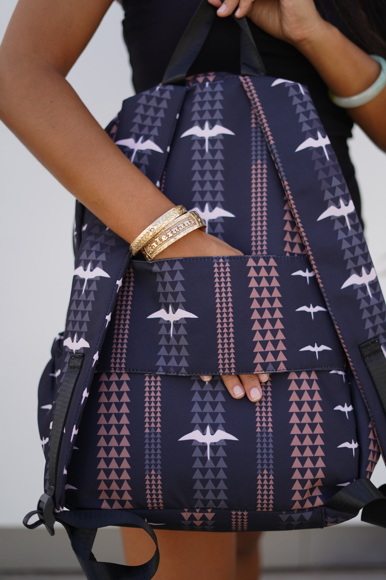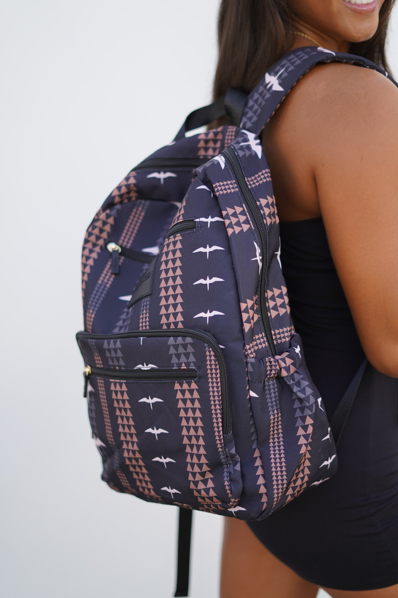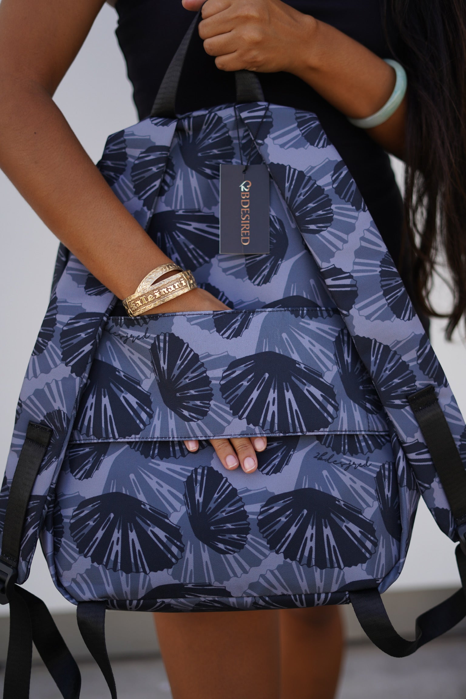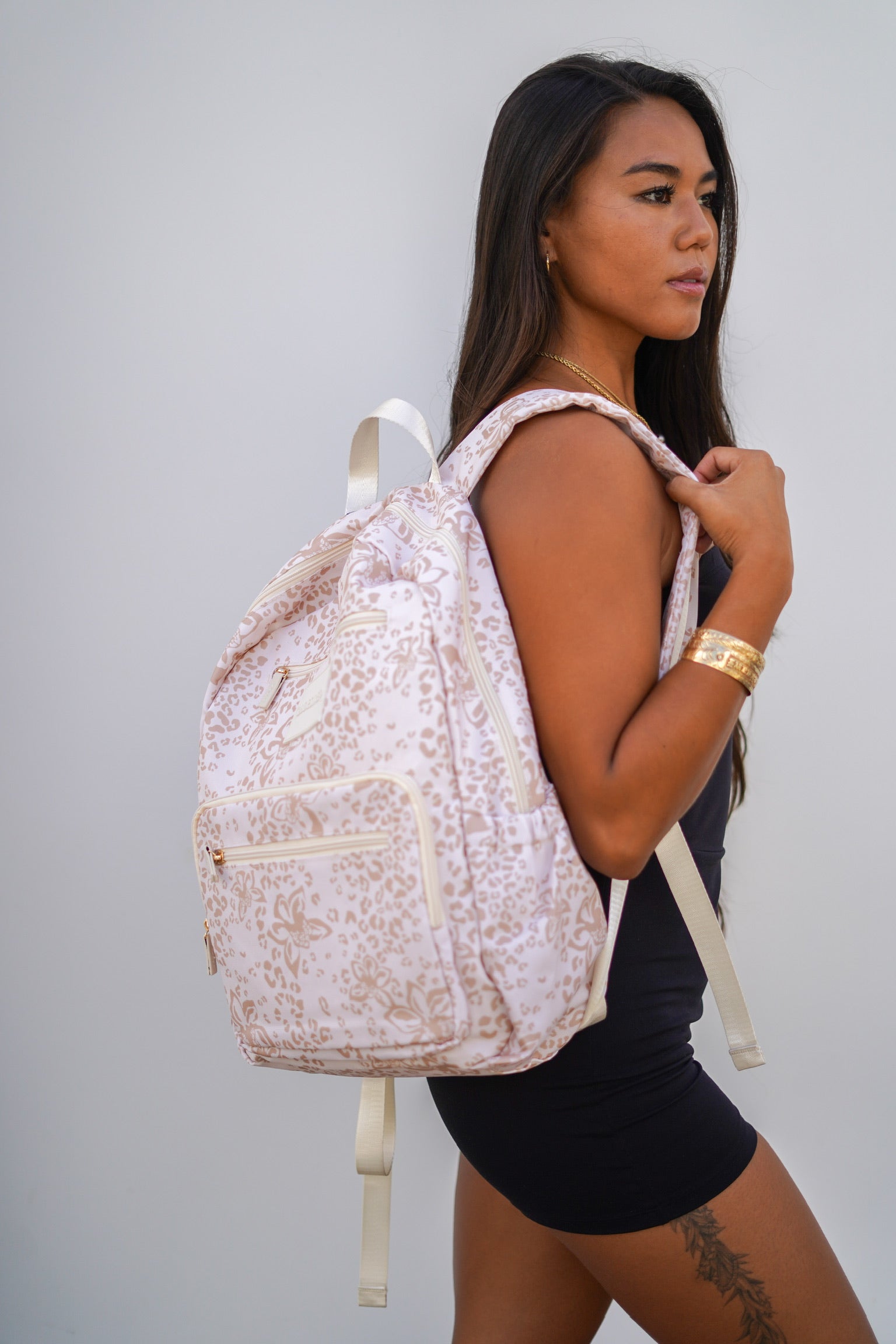 The Hana Backpack is durable and spacious! Available in 5 prints: Opihi, Lōkahi Black, Puakenikeni Pikake Black, Orchid Cheetah Nude, and Mauka.
