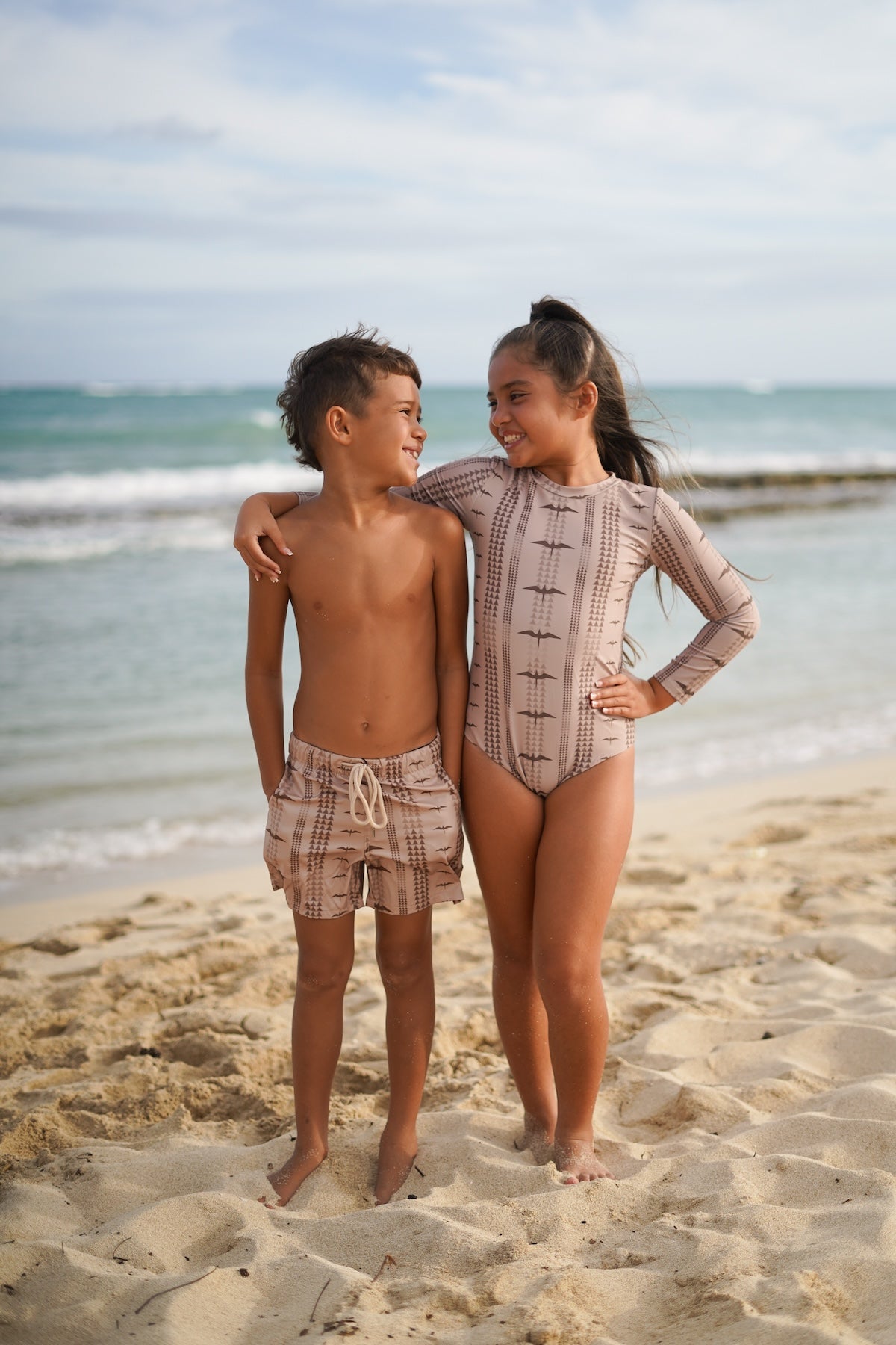 Match your keiki! Our Ohana Matching Swim collection includes these adorable boys swim shorts. Now available in Lōkahi Nude.