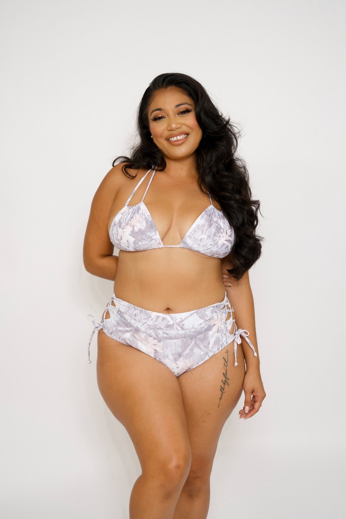 The Alohi top is sexy and versatile! Wear it as a halter tied behind the neck, or you can tie behind the back for a bandeau! Now available in our Mauna Kea print. Pair with our Laced High Waisted Bottom.