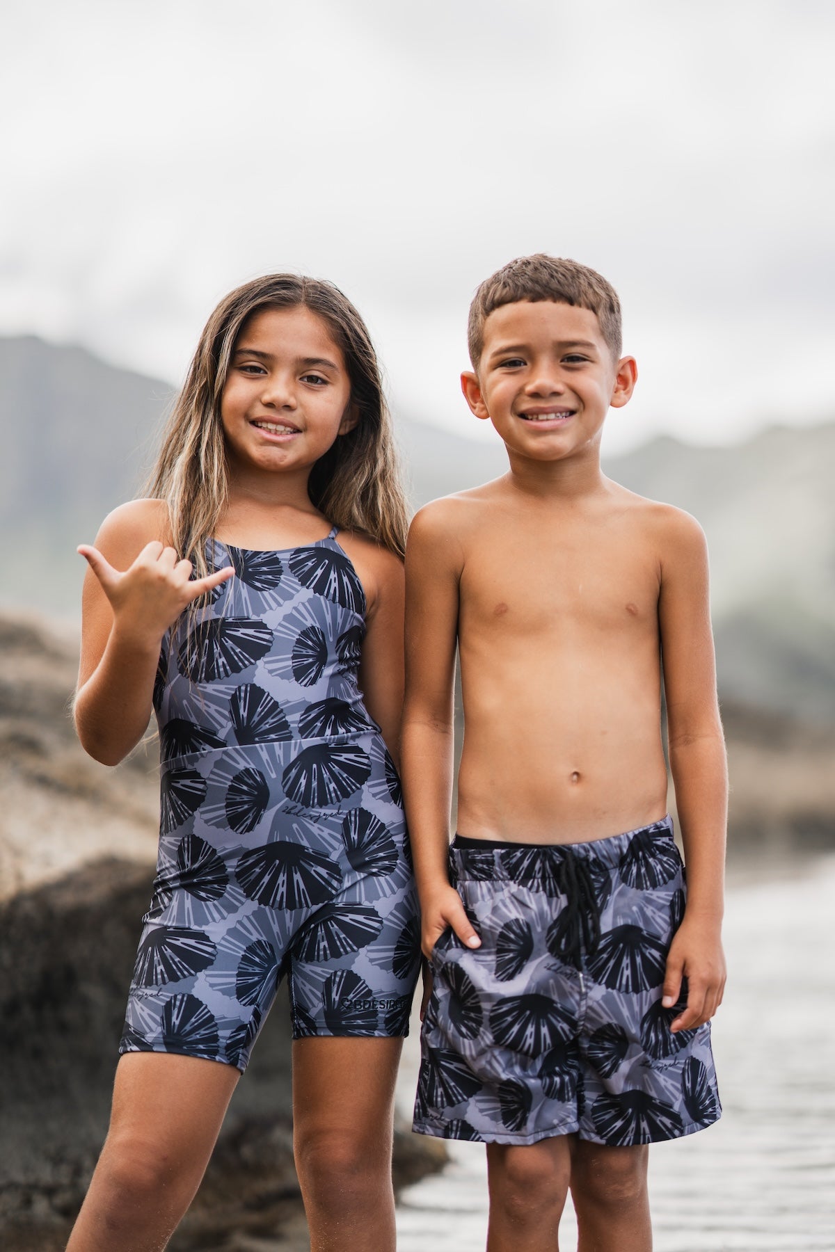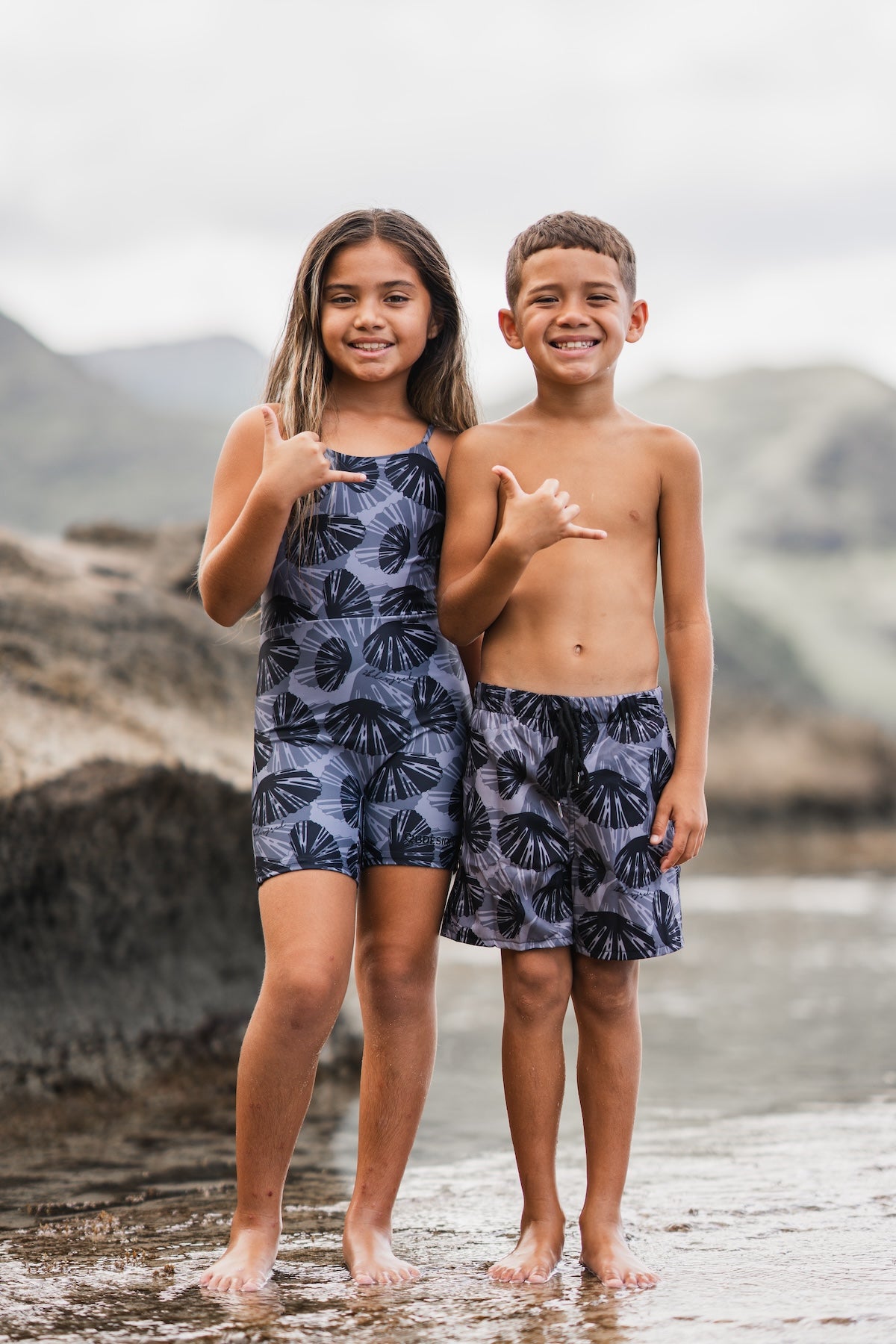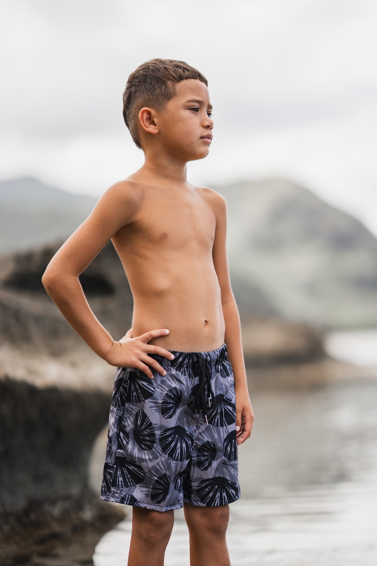 Match your keiki! Our Ohana Matching Swim collection includes these adorable boys swim shorts. Now available in our Mauka Print!