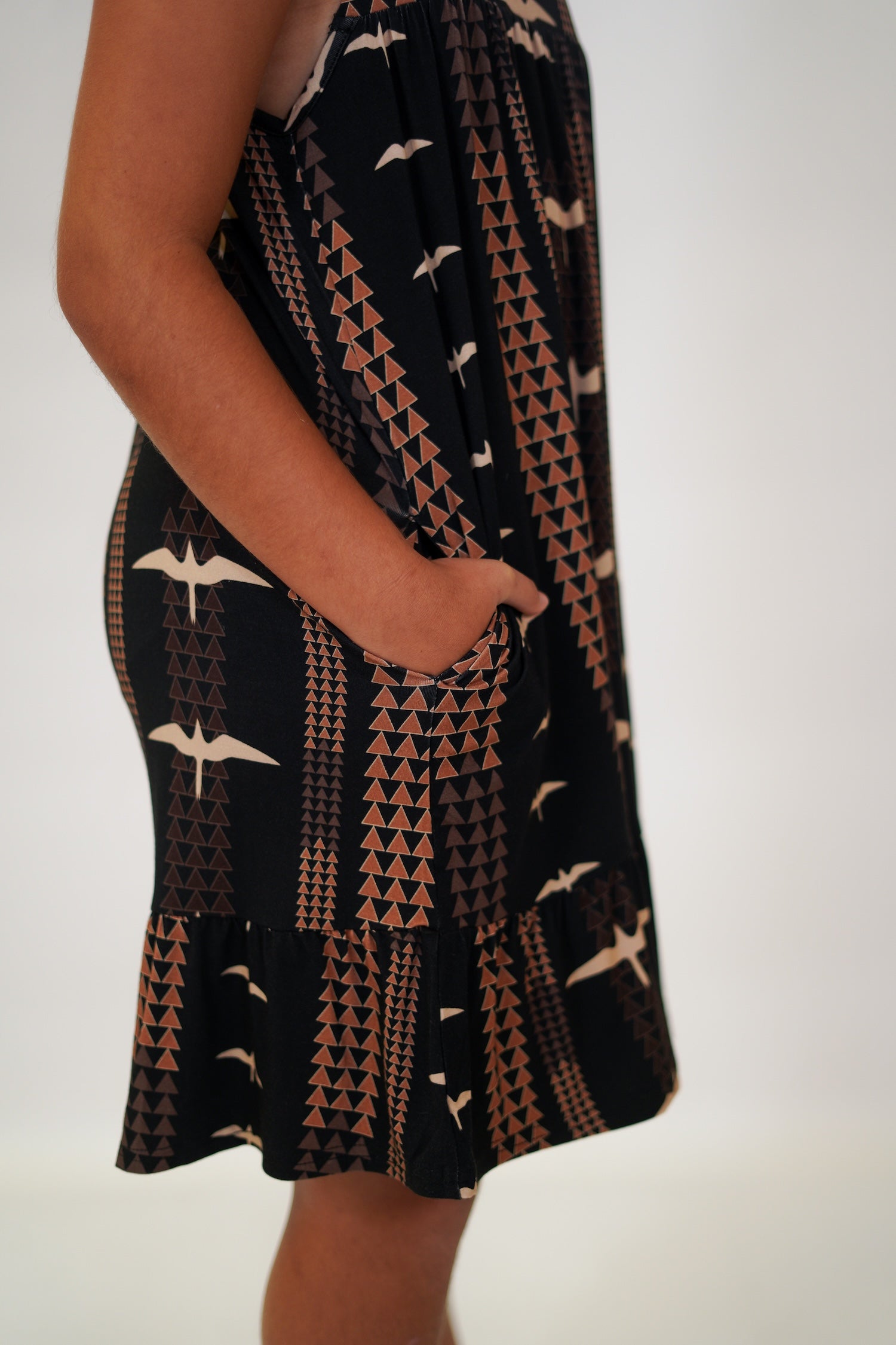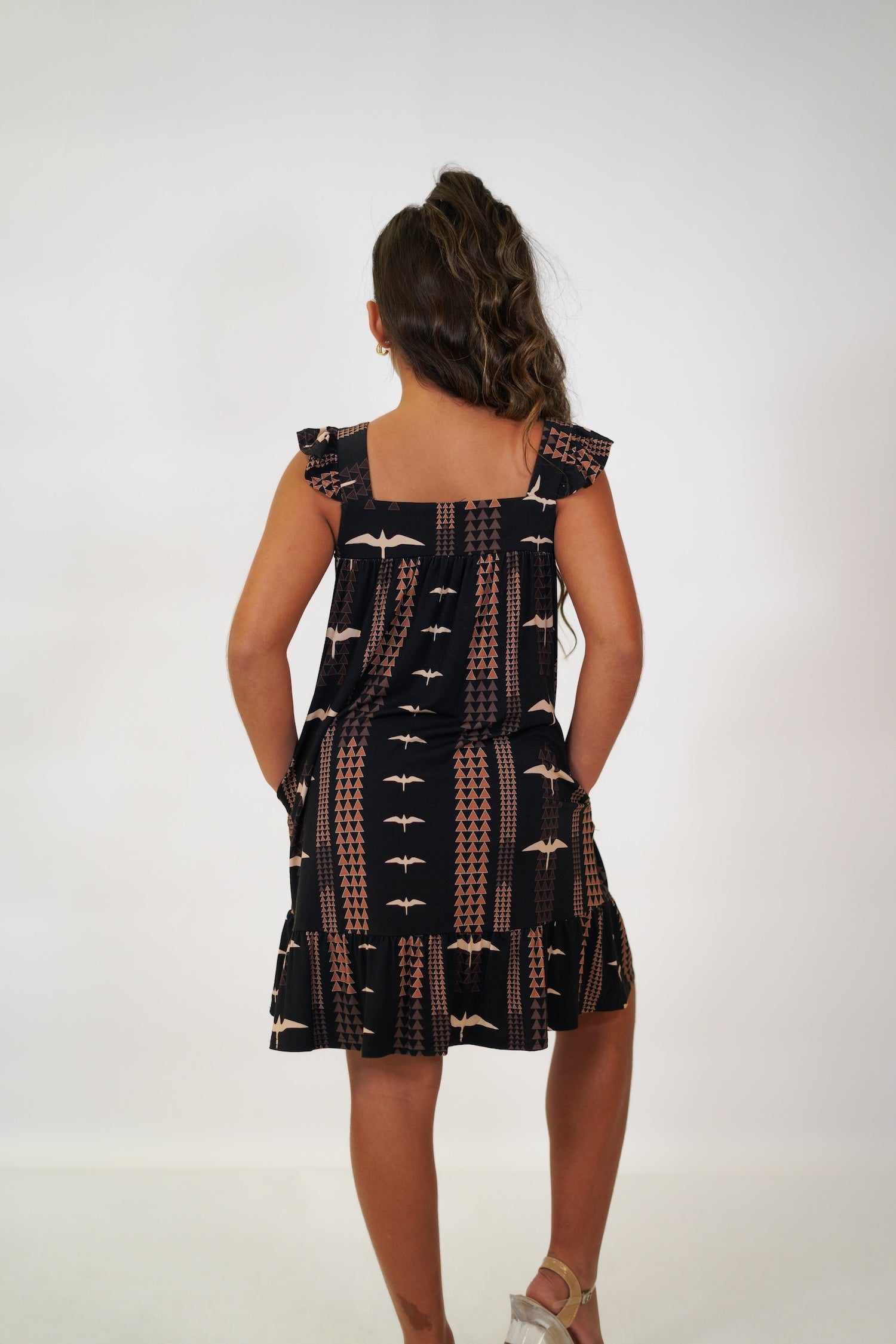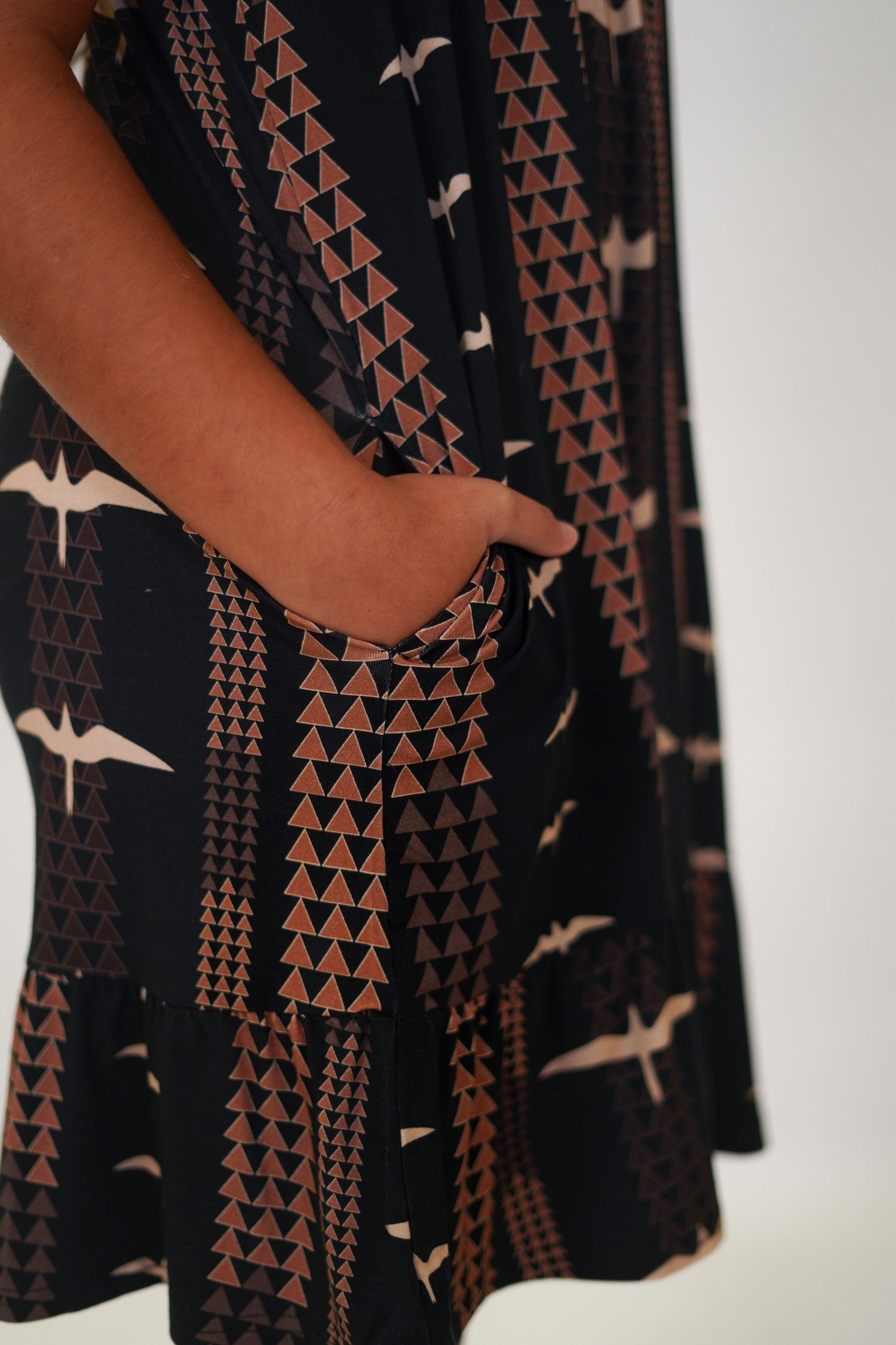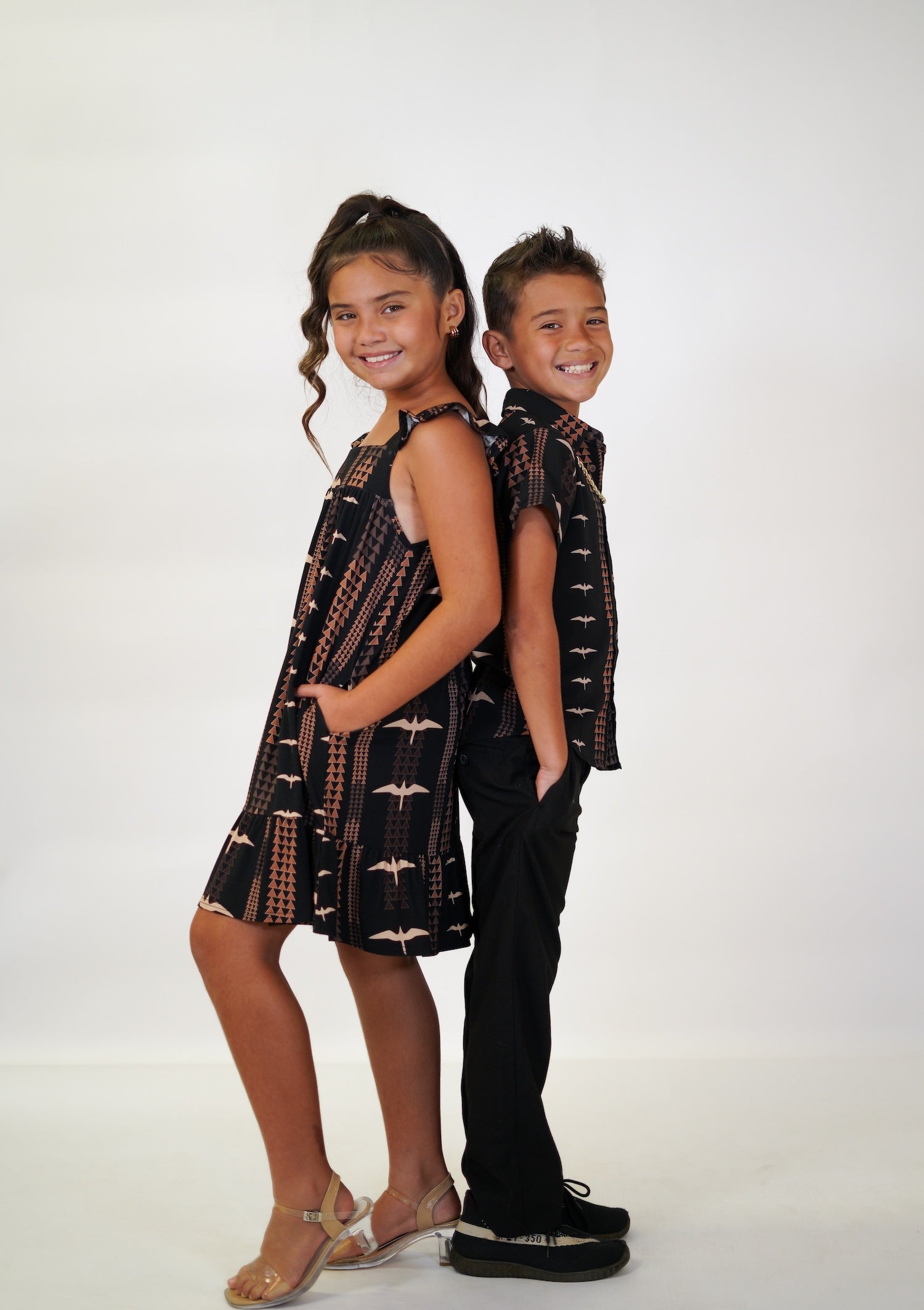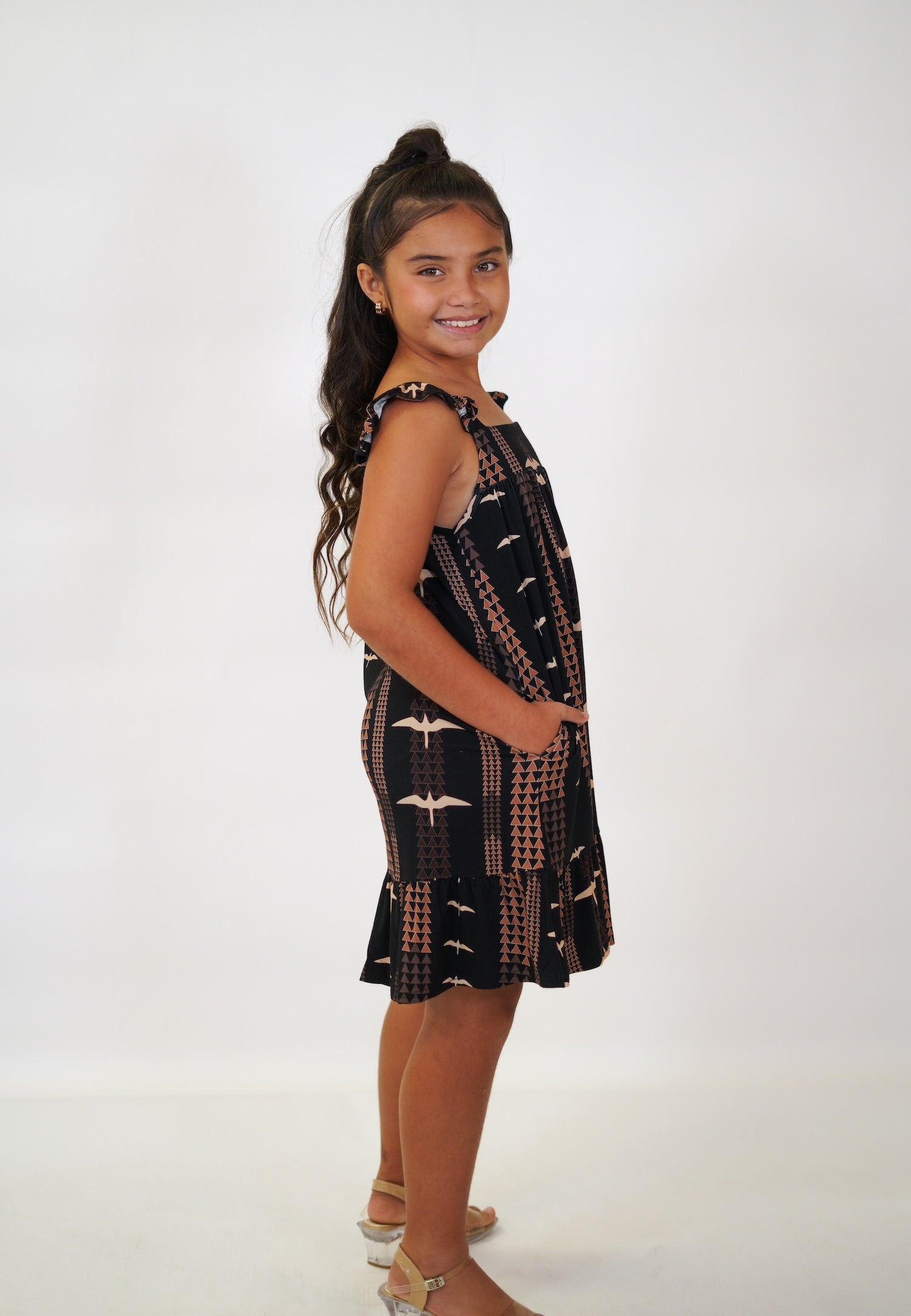 The Paisley Keiki Girl Dress is part of our Lōkahi Black Matching Apparel Collection! Soft and stretchy bamboo cotton , ruffle sleeves and trim, pockets.