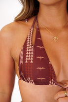 Cutout detail at top of triangle with double spaghetti strap neck ties and single spaghetti strap back tie. Sizes XS-XXL. Available in Lōkahi Red.