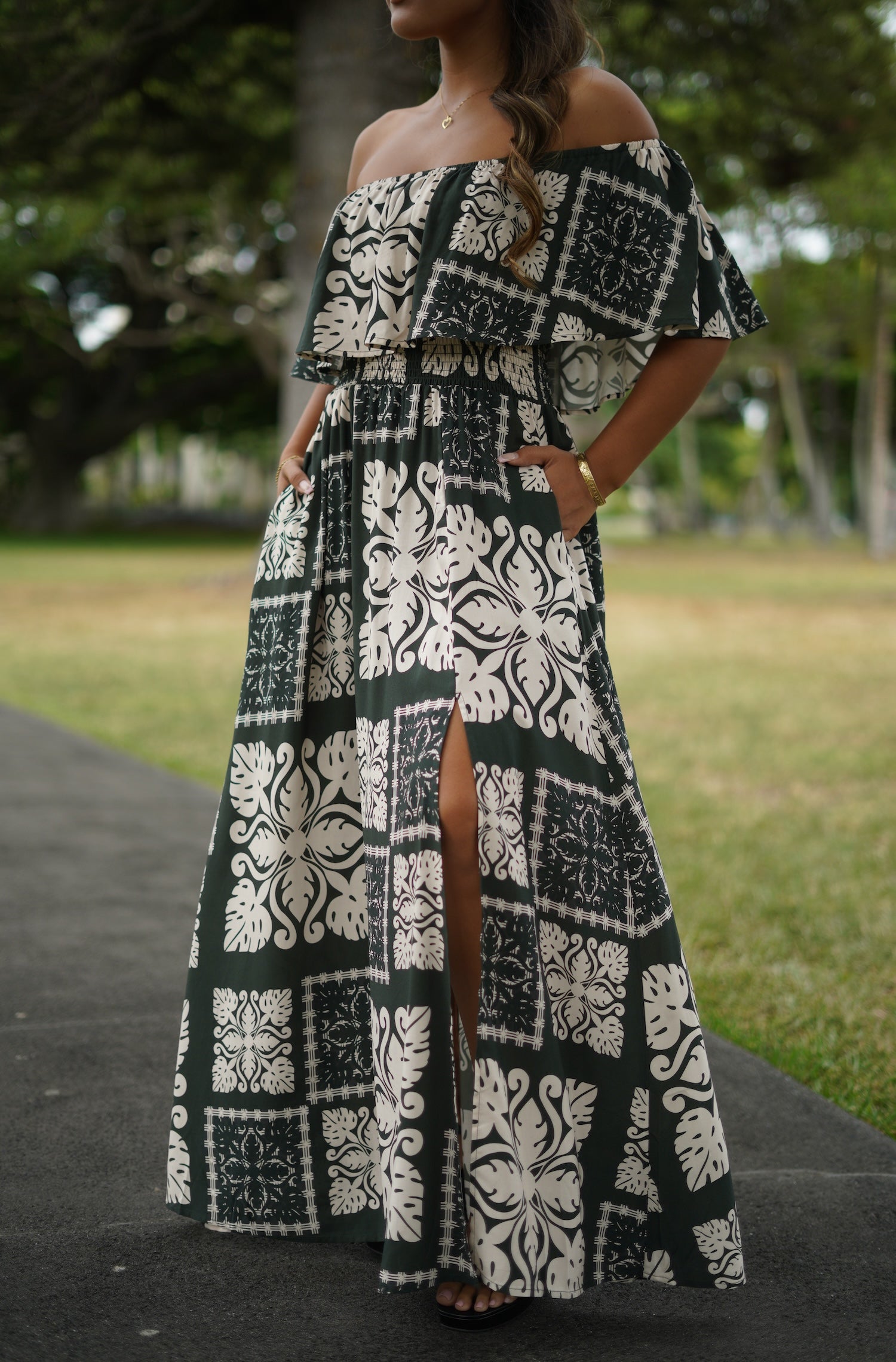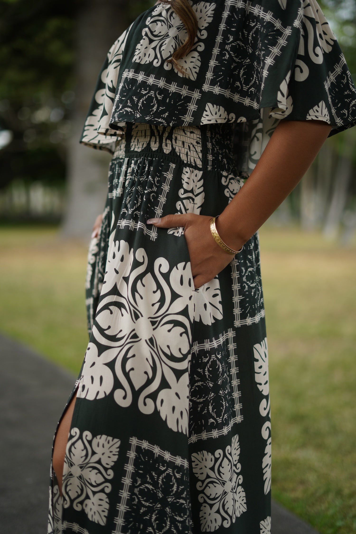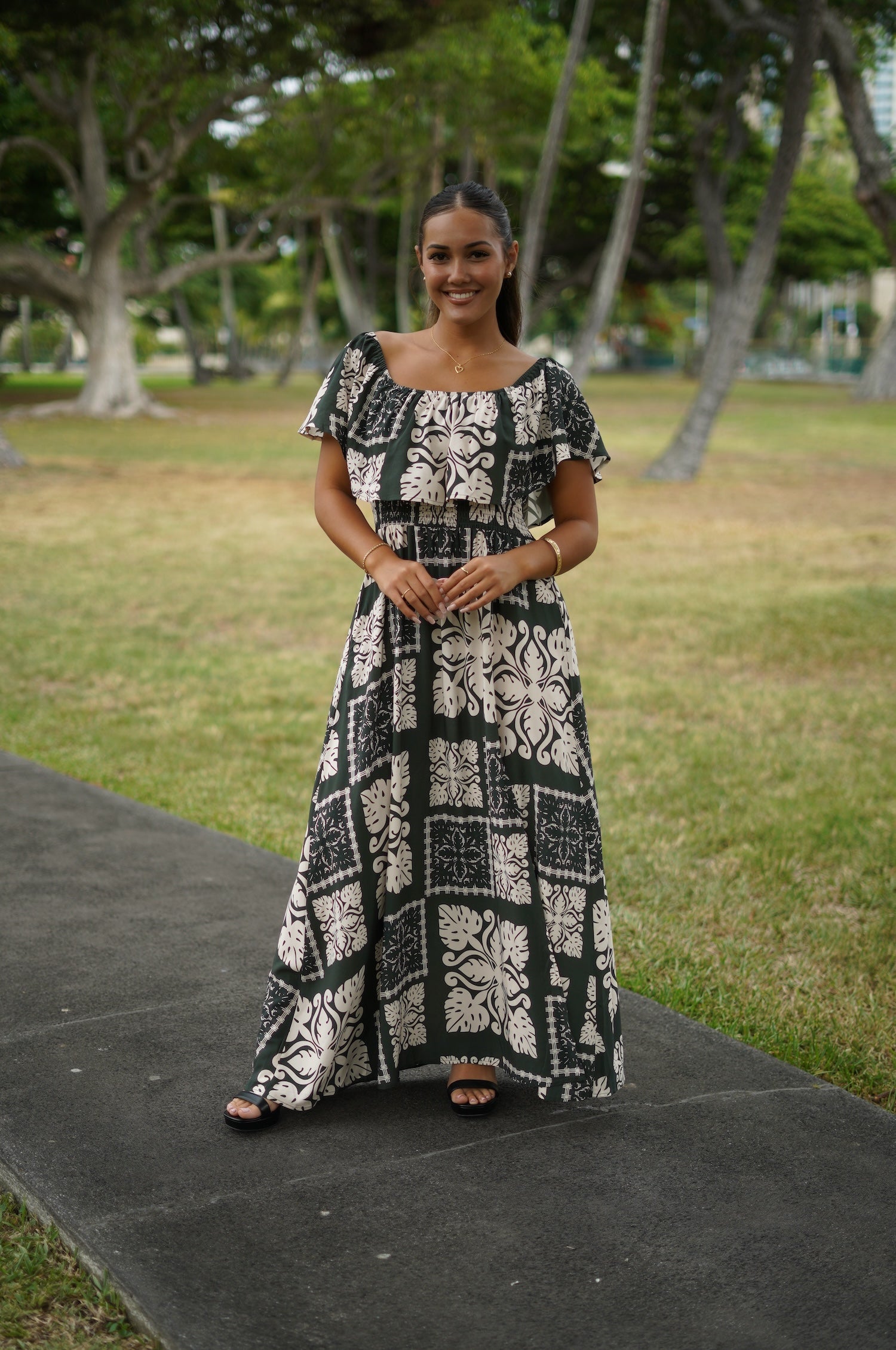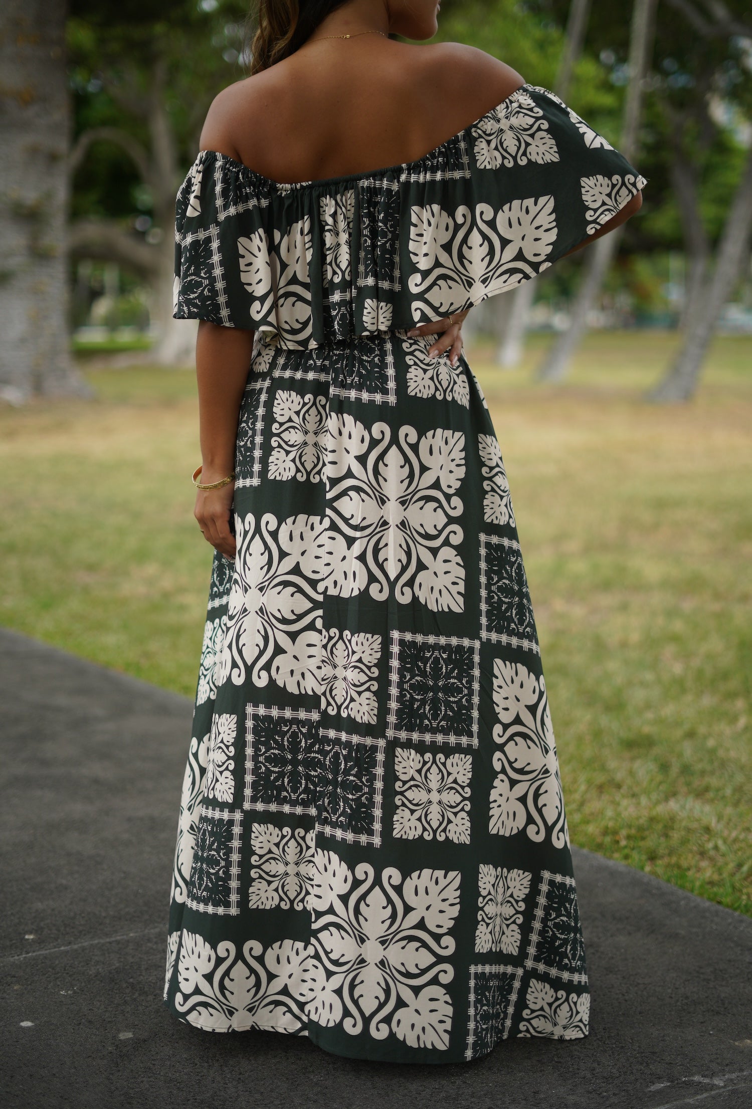 The Anela Maxi Dress is cute and comfortable! Available in Country Quilt Emerald.