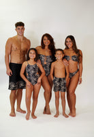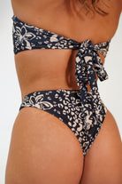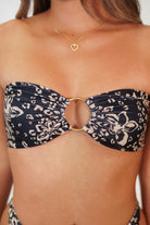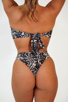 Strapless bandeau style top with ring detail in front and thick ties in back. Available in Orchid Cheetah Black.